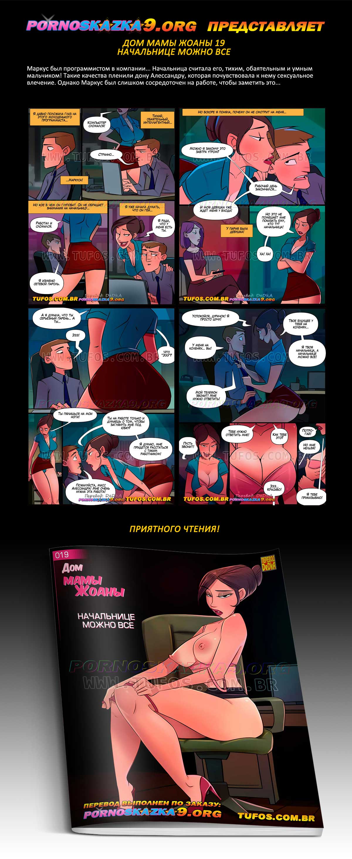 Порно комикс Дом мамы Джоаны 19. Начальнице можно все. Маркус был программистом в компании… Начальница считала его, тихим, обаятельным и умным мальчиком! Такие качества пленили дону Алессандру, которая почувствовала к нему сексуальное влечение. Однако Маркус был слишком сосредоточен на работе, чтобы заметить это…