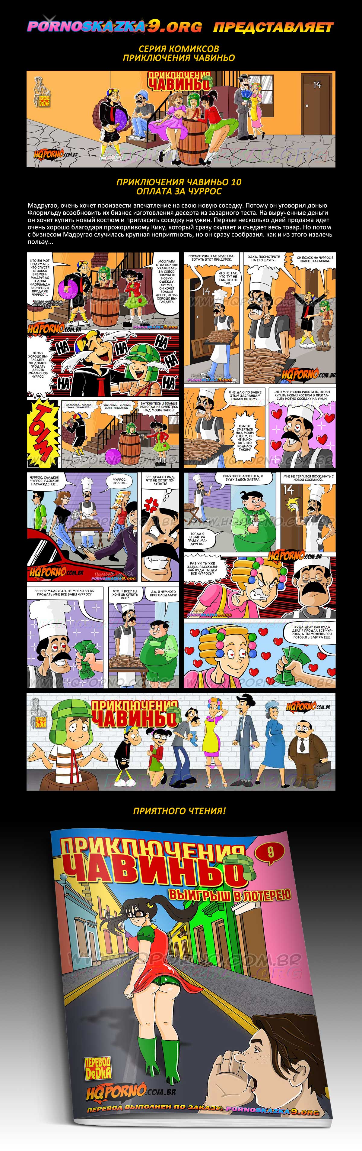 Порно комикс «Приключения Чавиньо. Часть 10. Оплата за чуррос.» Мадругао, очень хочет произвести впечатление на свою новую соседку. Потому он уговорил донью Флорильду возобновить их бизнес изготовления десерта из заварного теста. На вырученные деньги он хочет купить новый костюм и пригласить соседку на ужин. Первые несколько дней продажа идет очень хорошо благодаря прожорливому Кику, который сразу скупает и съедает весь товар. Но потом с бизнесом Мадругао случилась крупная неприятность, но он сразу сообразил. как и из этого извлечь пользу…